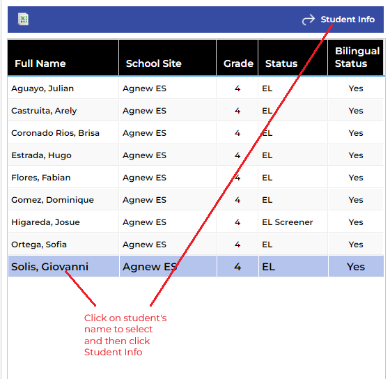 To select an individual student from the list on on the left, click on their name and then click Student Info at the top of the student list. This will change what you see on the right to the student's individual information.