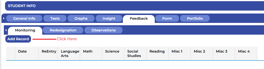 In the Feedback Tab you can create monitoring records, enter ELP Band Exit records, and create Observations. Watch the video below to learn about what's included in the Feedback tab.
